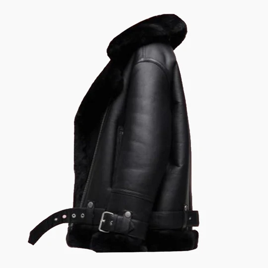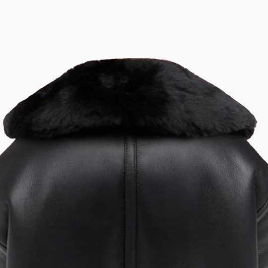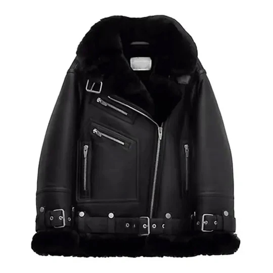 With the Women’s Black Moto Shearling Jacket, you can show off your edgy side. With a comfortable shearling interior and a sleek black leather outside, this jacket mixes tough moto design with luxurious luxury. Its striking design, which incorporates an asymmetrical collar, stud detailing, and a zip front, gives it a rebellious touch that elevates any ensemble.